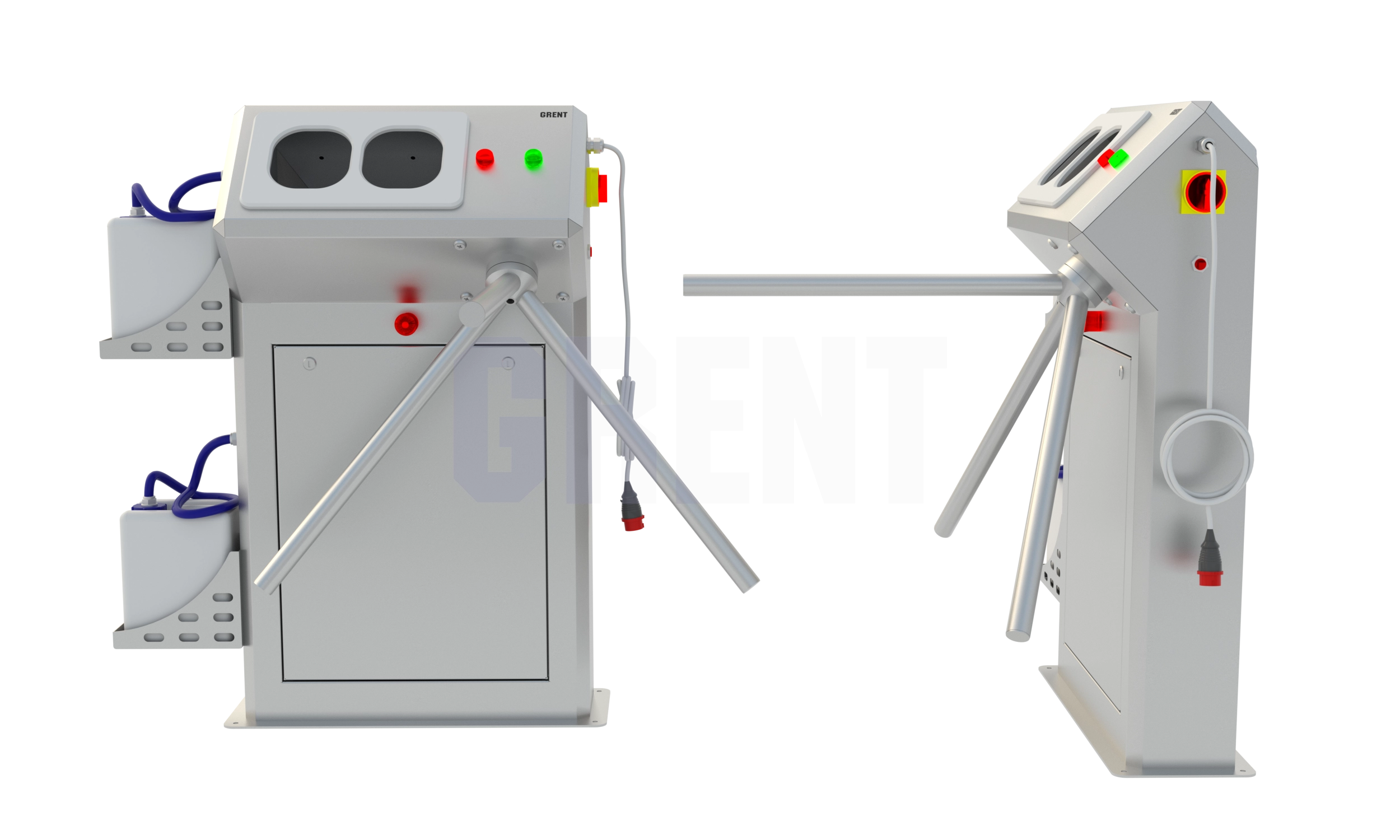 Станция гигиены рук GRENT 012 R предназначена для автоматической бесконтактной дезинфекции кистей рук персонала перед входом в чистую зону. Включение подачи дезинфицирующего средства происходит при поднесении обеих рук в зону срабатывания фотоэлементов, расположенных в дезинфицирующей камере. Дезинфицирующее средство подается автоматически при помощи электронасоса. Распыление дезсредства осуществляют 4 форсунки, расположенные в верхней и нижней части дезинфицирующей камеры, что обеспечивает обработку рук с двух сторон
